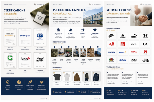 Trong giao tiếp B2B quốc tế, Company Profile (hồ sơ năng lực) là tài liệu buyer yêu cầu trước khi gặp mặt, trước khi đặt sample, và trước khi ký hợp đồng. Đây là bản tóm tắt toàn bộ năng lực và uy tín của doanh nghiệp bạn trong 4–8 trang. Một profile tốt không chỉ giới thiệu sản phẩm — nó phải thuyết phục buyer rằng: bạn đủ năng lực sản xuất đơn hàng của họ, bạn đáng tin cậy về chất lượng và tiến độ, và rủi ro khi làm việc với bạn là thấp.